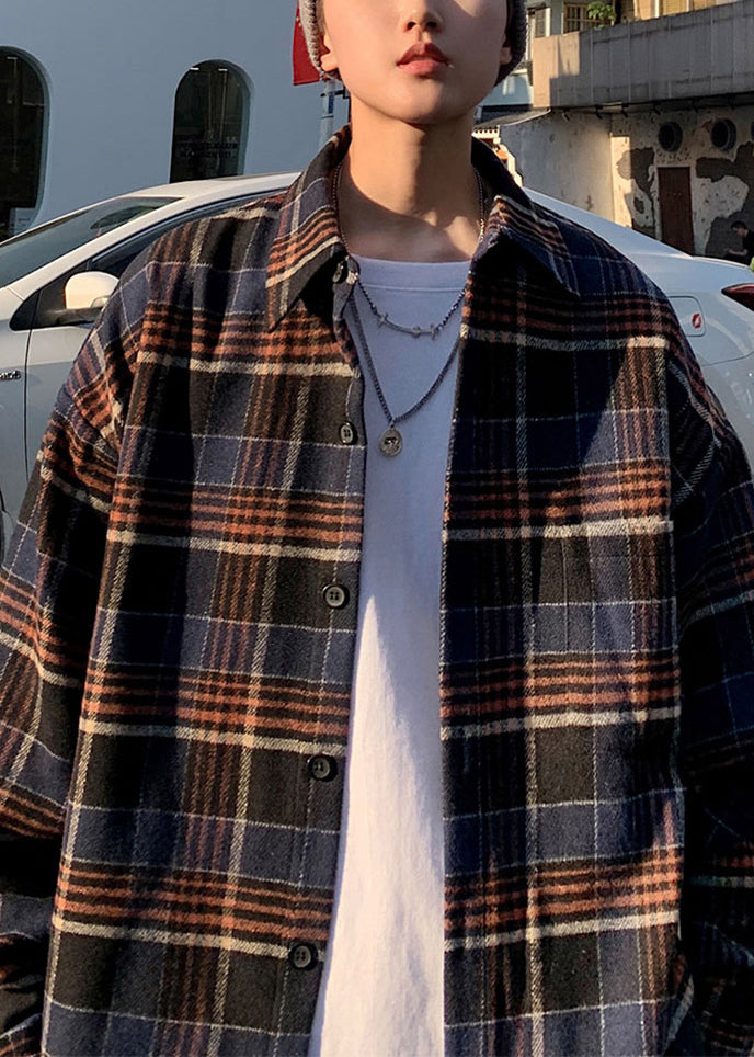 New Navy Peter Pan Collar Plaid Woolen Men Shirts Coat Fall RO007