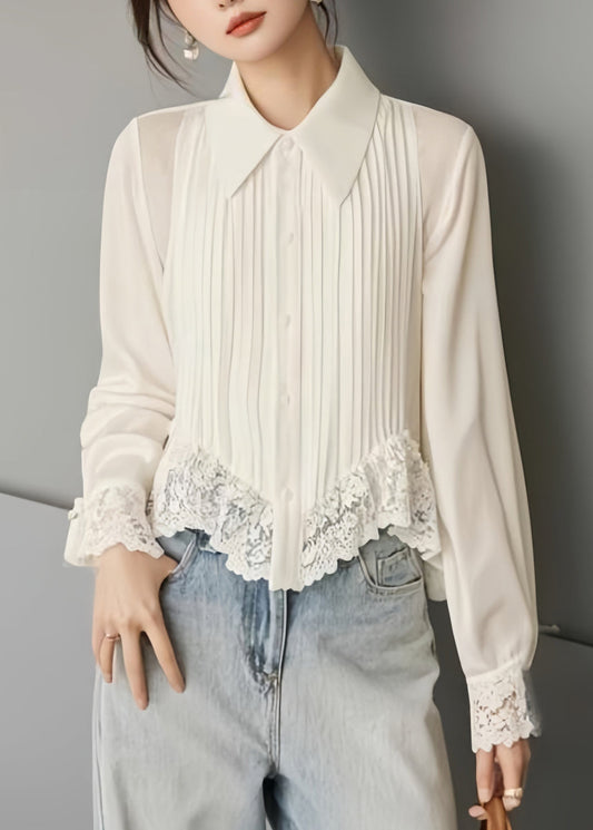 Art White Button Lace Solid Chiffon Blouses Spring RV040