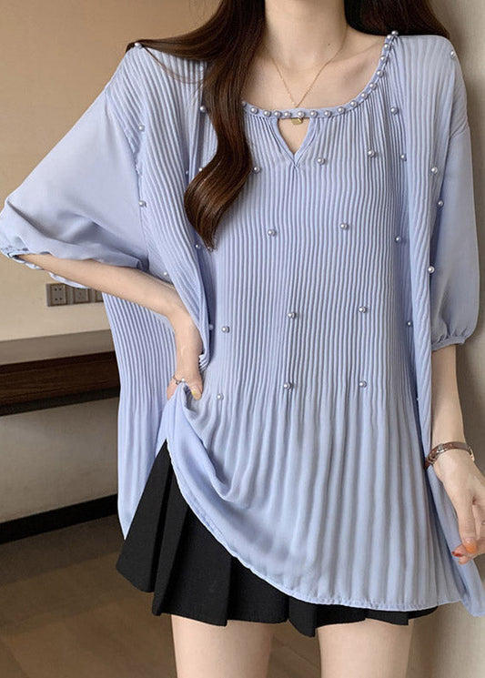 Chemisier en mousseline de soie à col rond et manches mi-longues avec patchwork de perles bleues RE036
