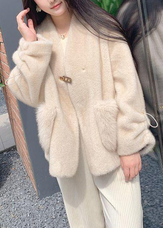 Cute Apricot V Neck Raccoon Hair Print Leather And Fur Coats Winter RD010