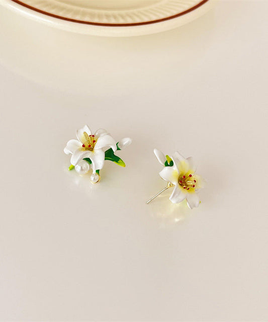 Pearl Earrings White Alloy Floral Copper Stud Elegant