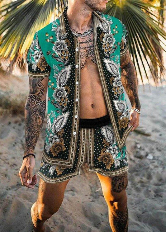 Chemises hawaïennes amples à imprimé col Peter Pan vert pour hommes, été HG031