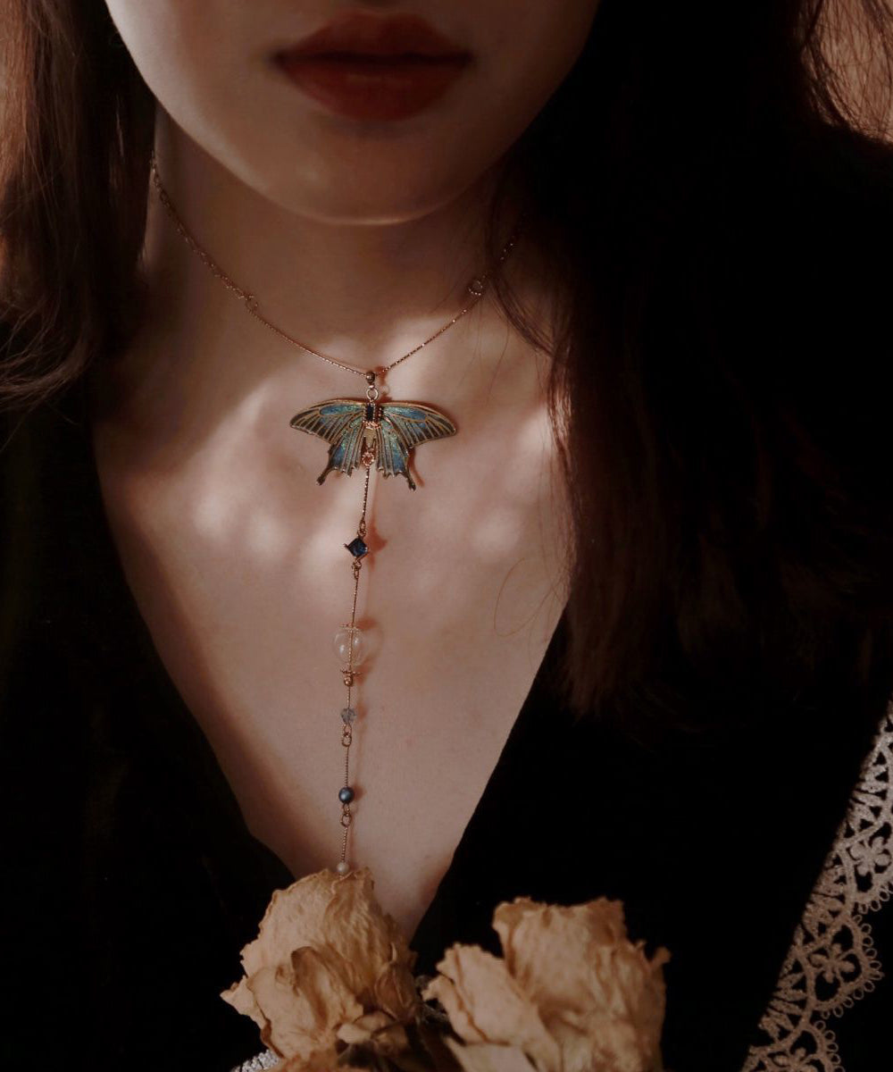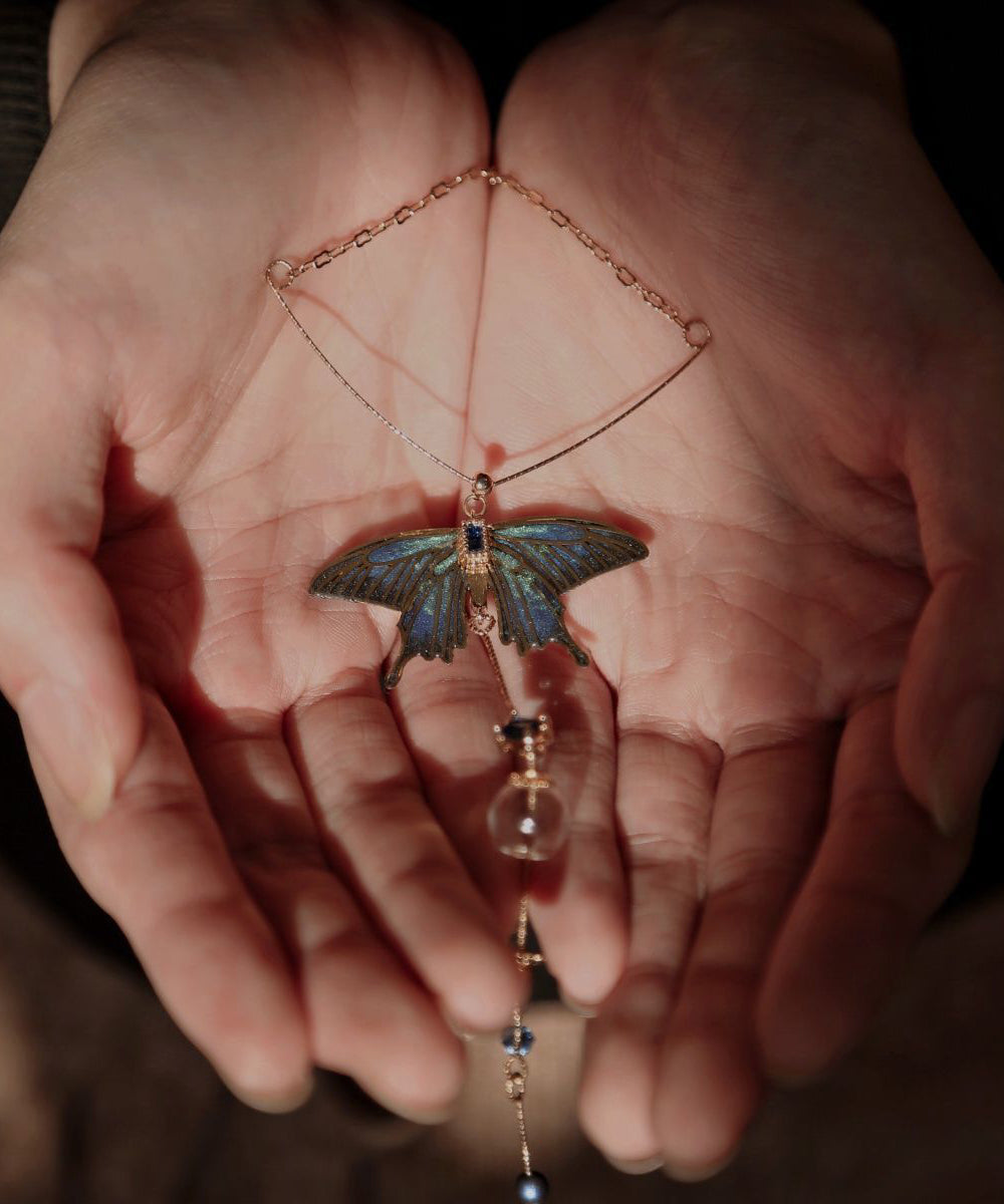 Chinese Style Gold Copper Overgild Zircon Glass Bead Wing Pendant Necklace