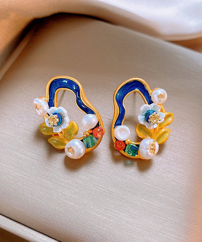 Stylish Blackish Green Copper Overgild Pearl Floral Stud Earrings