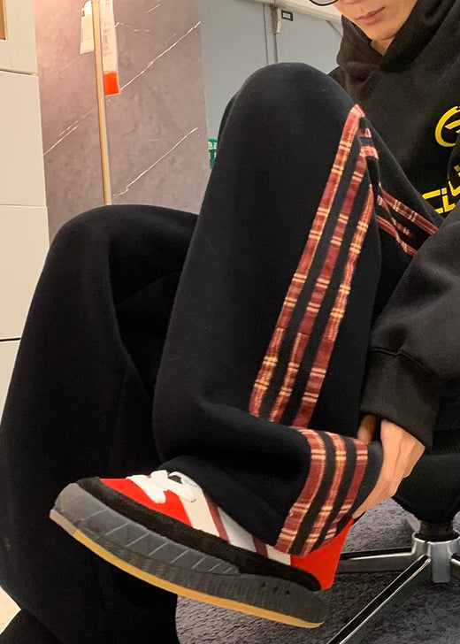 Casual Black Striped Warm Fleece Men Pants Elastic Waist Spring RM051