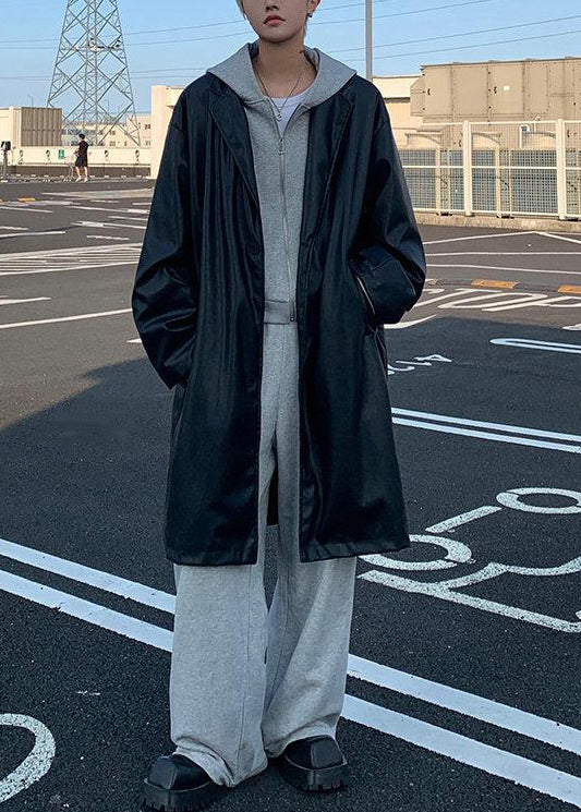 French Black Notched Button Faux Leather Mens Coat Spring RN033