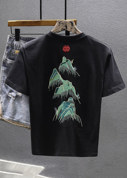 T-shirt simple en coton uni brodé noir pour homme, été LK061
