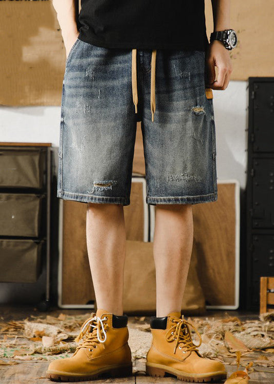 Classy Blue Hole Lace Up Denim Men Shorts Elastic Waist Summer YL022