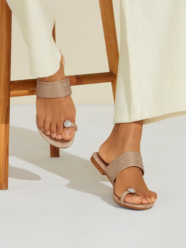 Women's Flat Heel Champagne Slip-On Sandals with Rhinestone