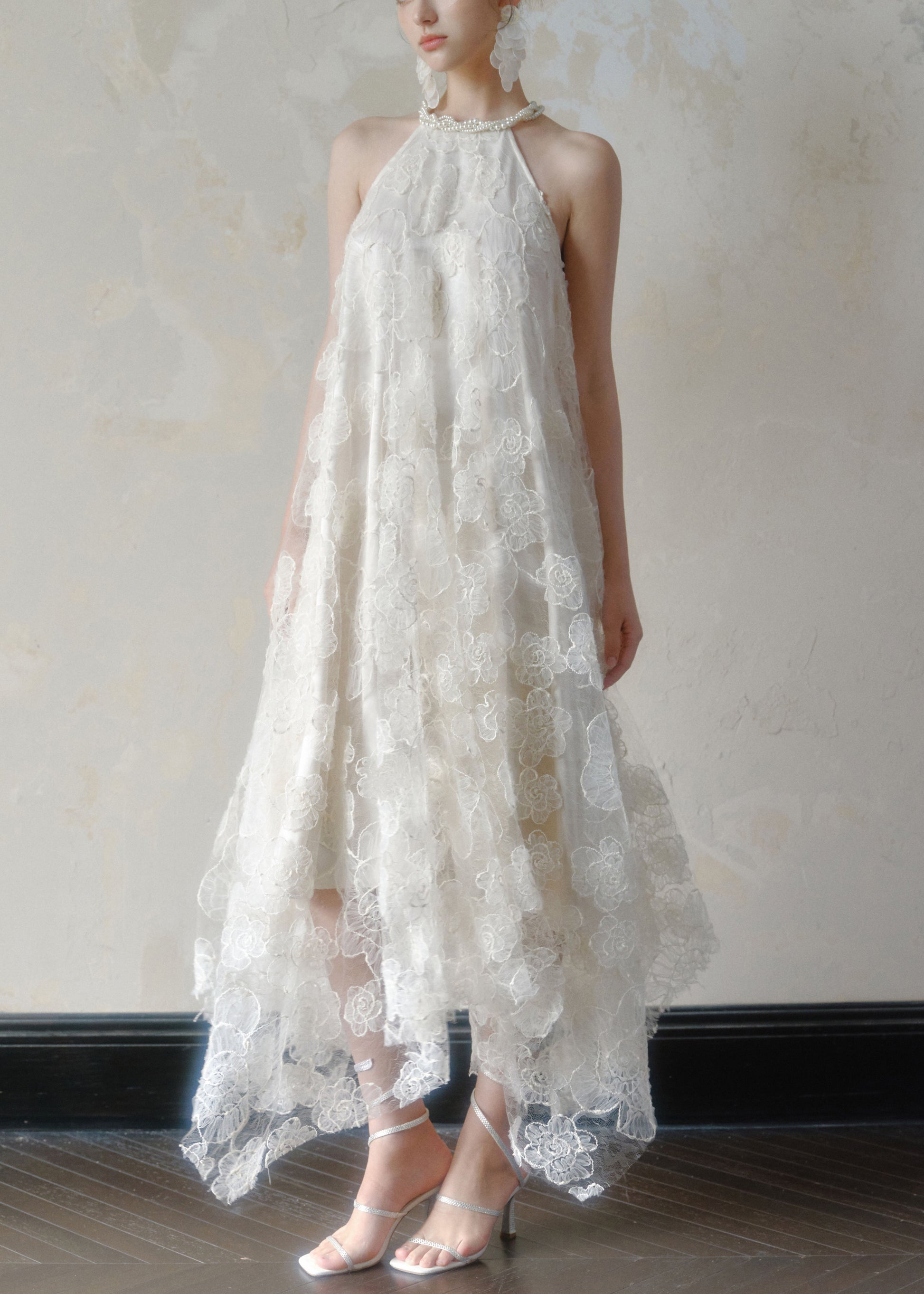 Art White Asymmetrical Pearl Lace Long Dress Sleeveless