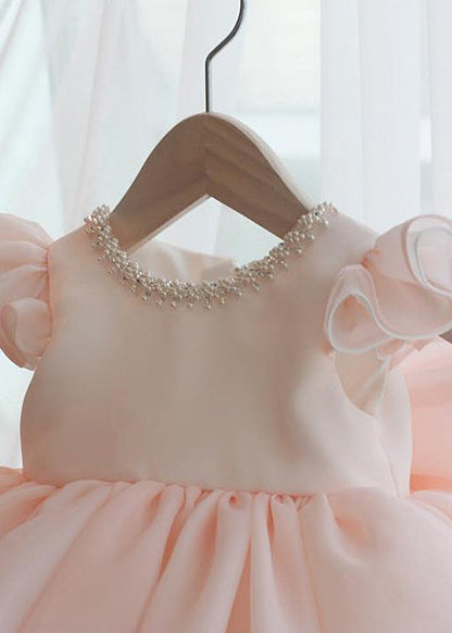 Beautiful Pink Nail Bead Patchwork Tulle Kids Long Dresses Short Sleeve YS039