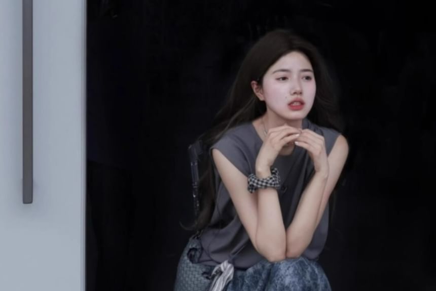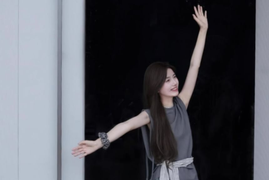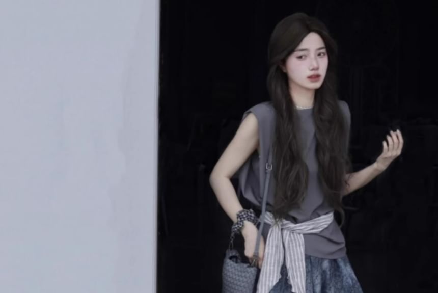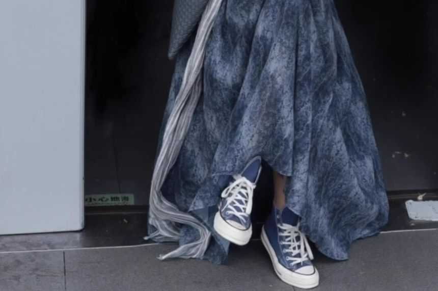 Cap-Sleeve Crew Neck Plain Tee / High Waist Tie Dye Maxi A-Line Skirt / Belt / Set