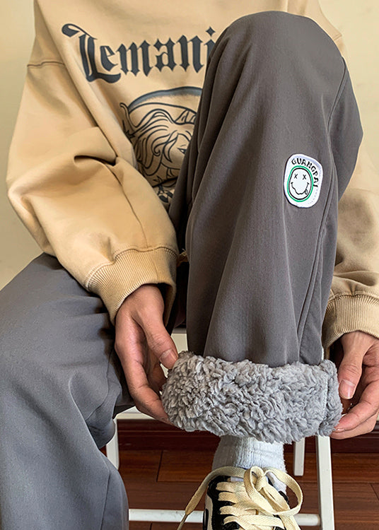 Casual Grey Elastic Waist Thick Fleece Wool Lined Men Pants Winter RM025