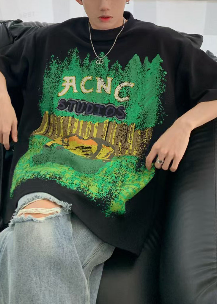 Casual Half Print Black Men's Cotton Shirts O-Neck T Sleeve
