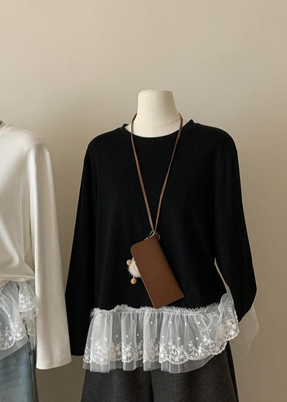 Casual White O Neck Lace Patchwork Cotton T Shirts Top Spring YF001
