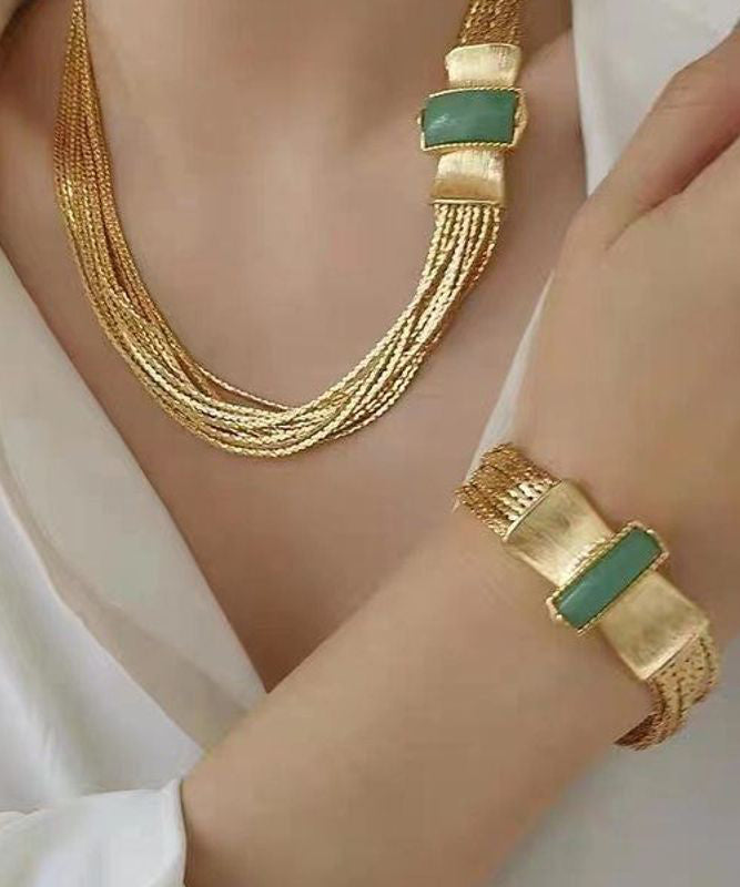 Boho Sterling Silver Overgild Jade Weave Necklace And Chain Bracelet Two-Piece Set