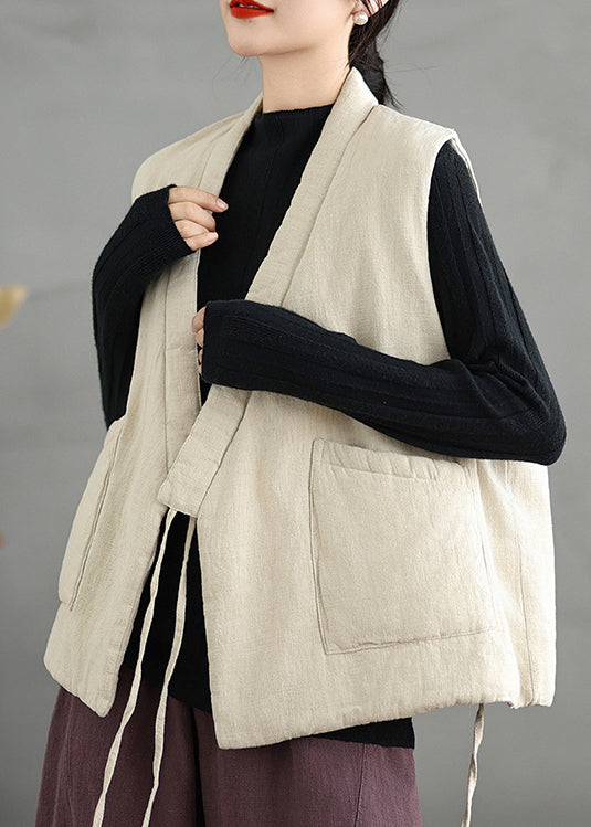 Elevate your style with our Chinese-inspired Beige V Neck Lace Up Fine Cotton Filled Vest Sleeveless. Made with premium materials and exquisite craftsmanship, it exudes elegance and sophistication. Perfect for any occasion, it combines comfort and luxury for the ultimate fashion statement.