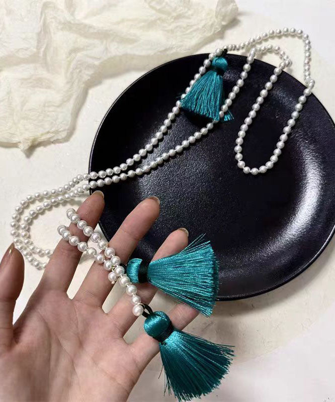 Indulge in the opulence of our Chinese-inspired alloy necklace adorned with luminous pearls and intricate beading, finished with a luxurious tassel pendant.