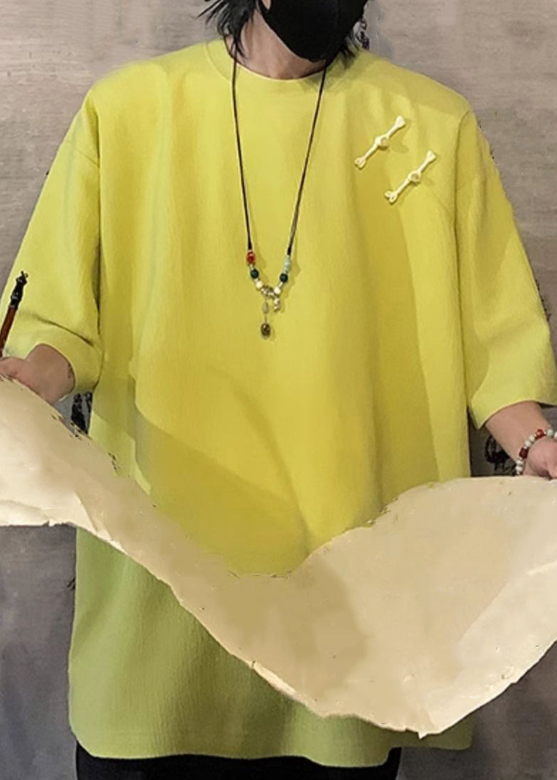 Loose Fluorescent Green Button Solid Cotton Men T Shirts Half Sleeve