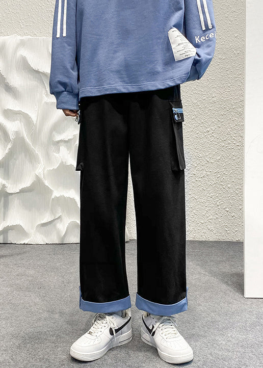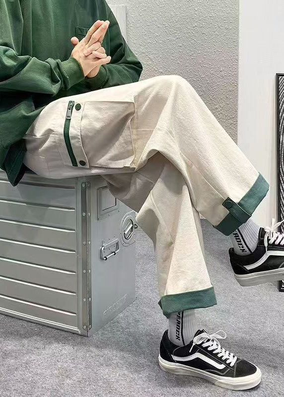 Cotton Pockets Beige Patchwork Zip Up Men Casual Crop Pants