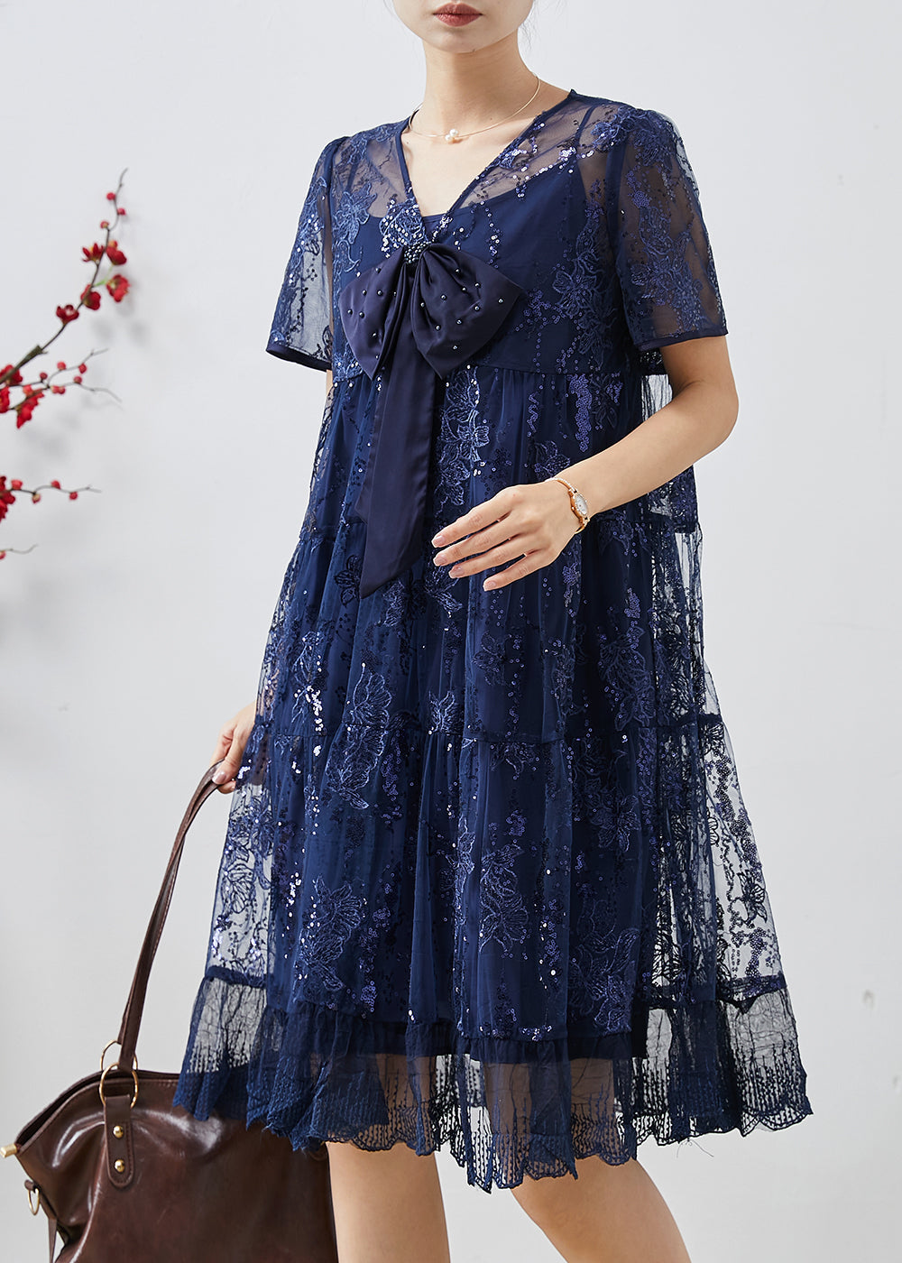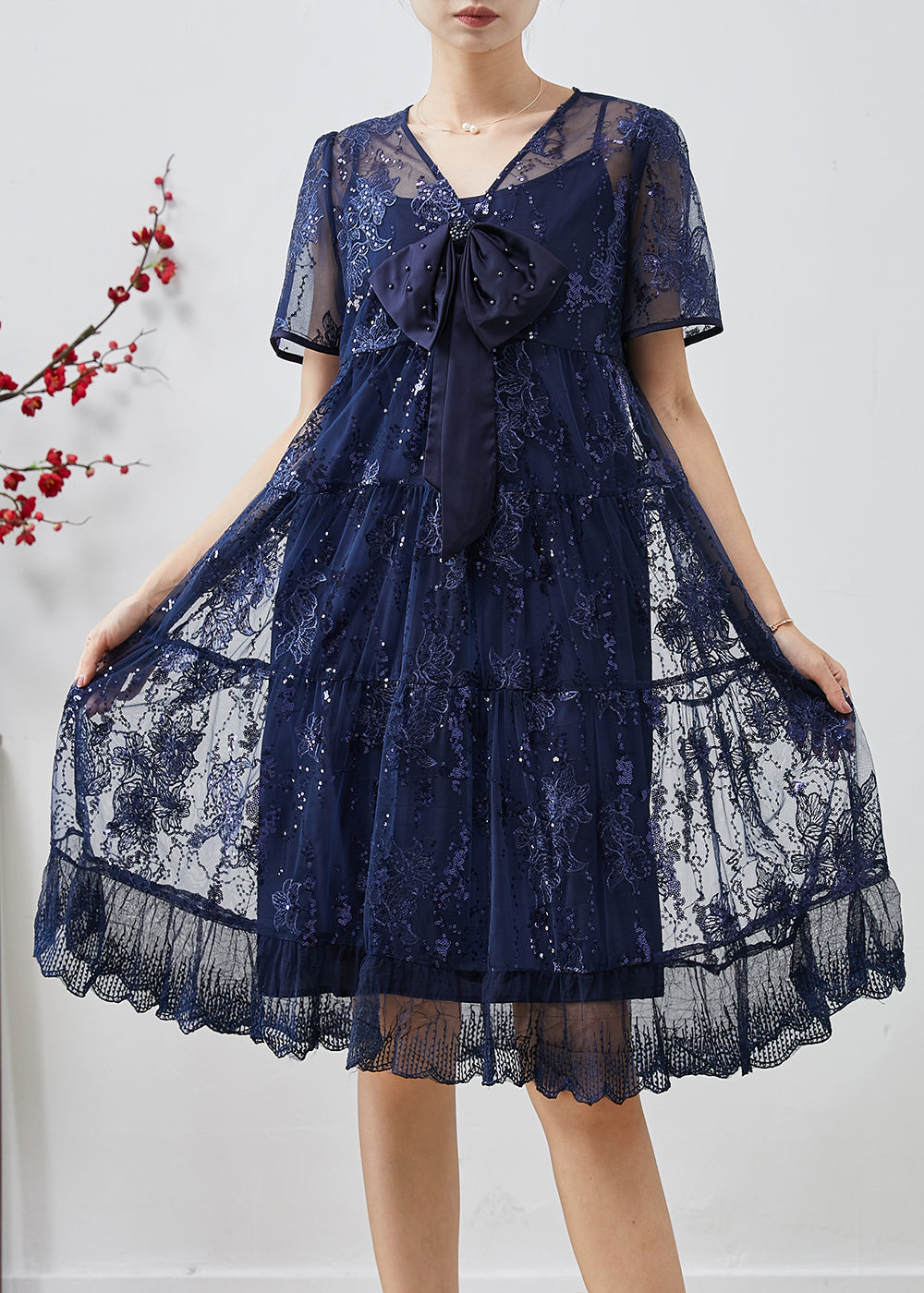 DIY Navy Sequins Embroidered Tulle Bow Dresses Summer AP1066
