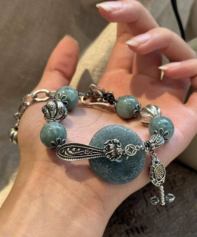 Fine Blackish Green Sterling Silver Jade Ping Buckle Charm Bracelet