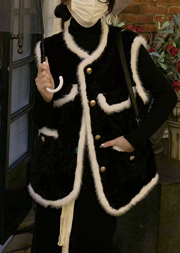 Fitted Black O-Neck Pockets Patchwork Faux Fur Vest Sleeveless RY006
