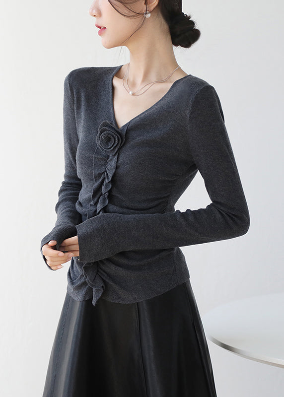 Fitted Red V Neck Ruffled Floral Knit Top Spring TY030