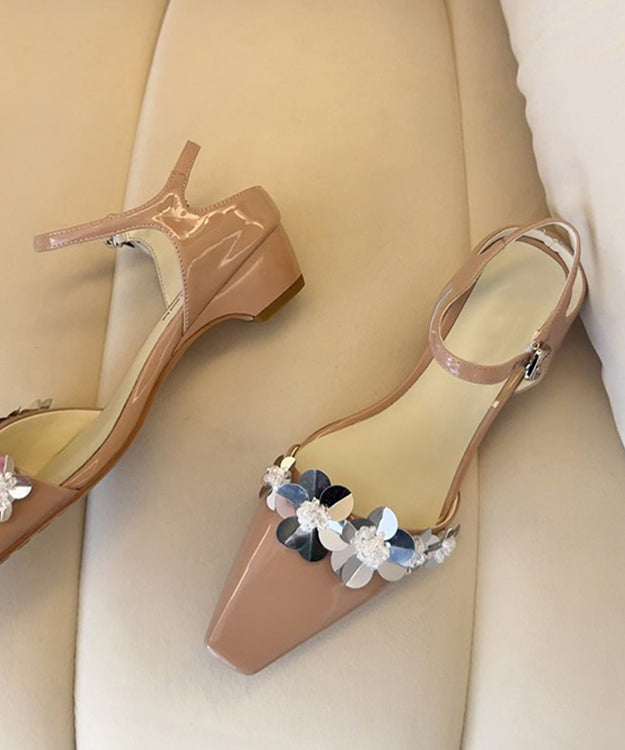 Floral Black Sandals Splicing Leather Chunky Faux