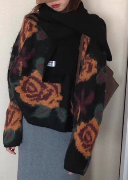 French Black O Neck Floral Jacquard Knit Sweater Tops Spring TN027