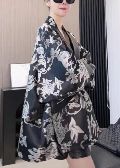 French Black V Neck Print Patchwork Faux Leather Coat Spring YW041