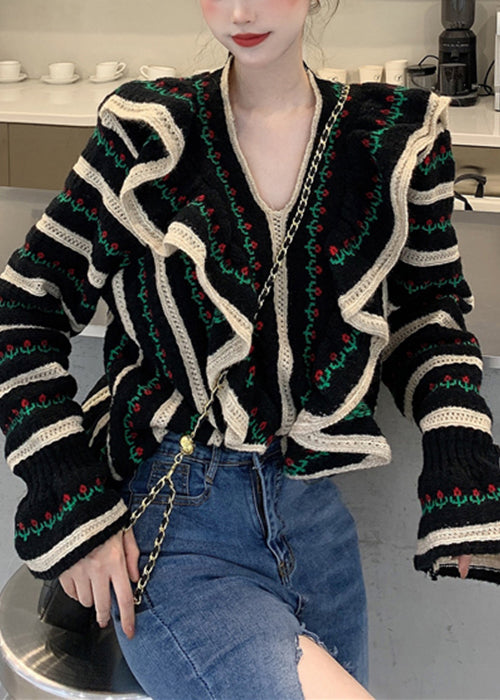 French Black V Neck Ruffled Hollow Out Knit Sweaters Spring TY024