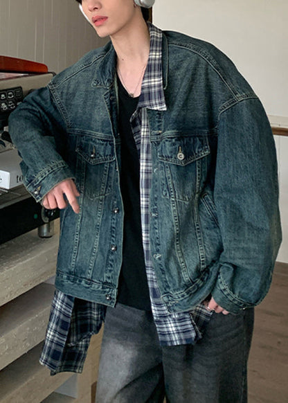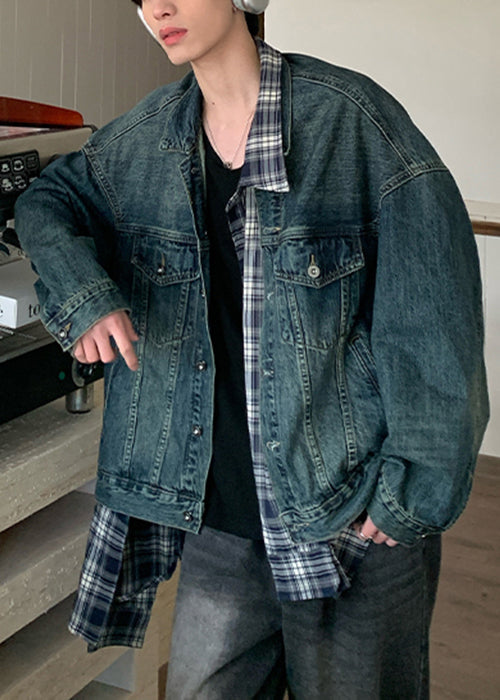 Coats False Mens Two Spring TC049 Plaid Blue Pieces Denim Patchwork French