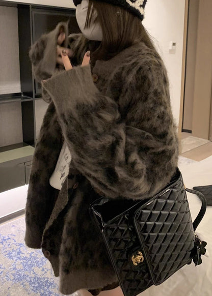 French Coffee O Neck Leopard Print Button Knit Cardigans Spring TN033