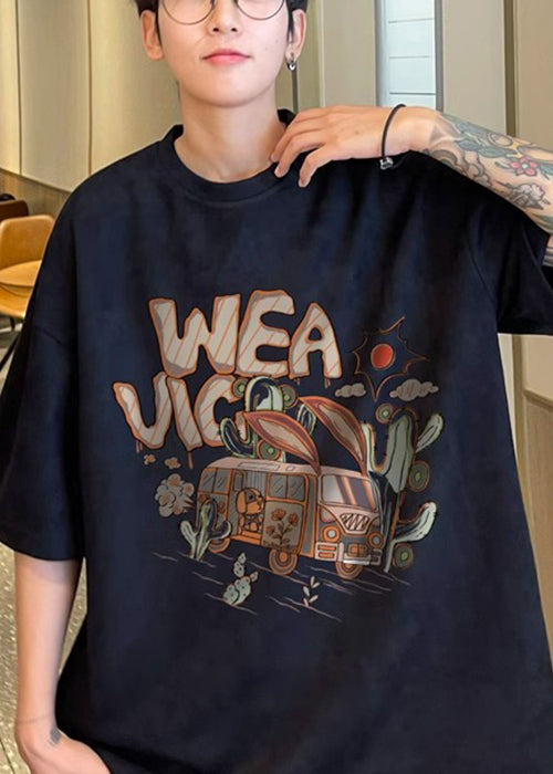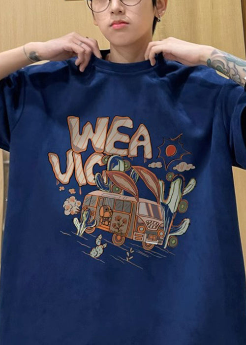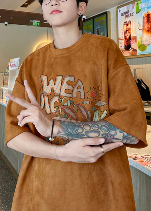 Vintage Army Green O Neck Print Faux Suede Men T Shirt Half Sleeve