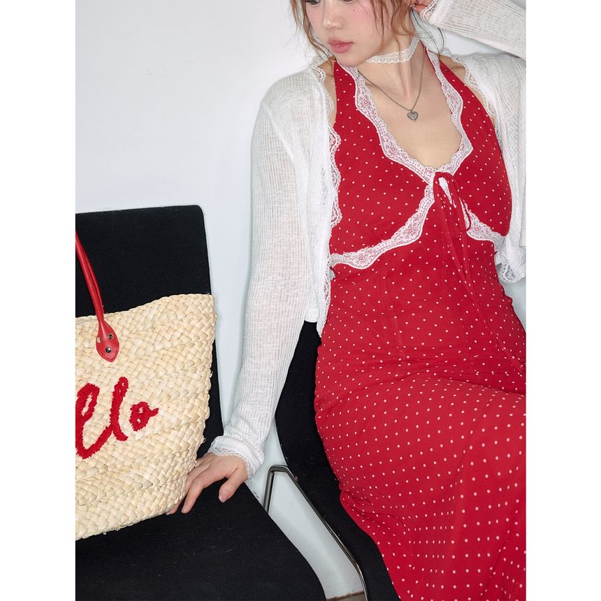 Halter Dotted Bow Lace Trim Midi A-Line Dress / Plain Cardigan
