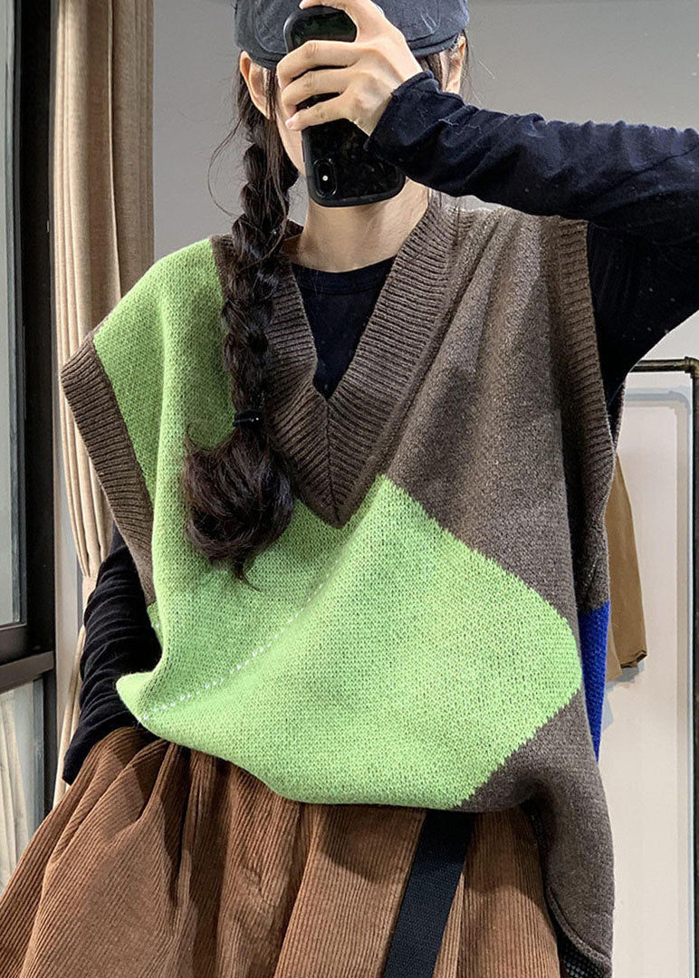 Italian Colorblock V Neck Patchwork Knit Vest Sleeveless TJ005