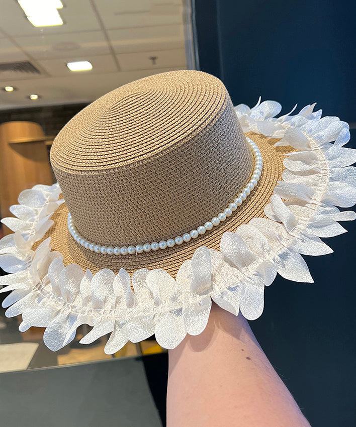 Japanese Elegant Black Pearl Lace Edge Straw Woven Cloche Hat