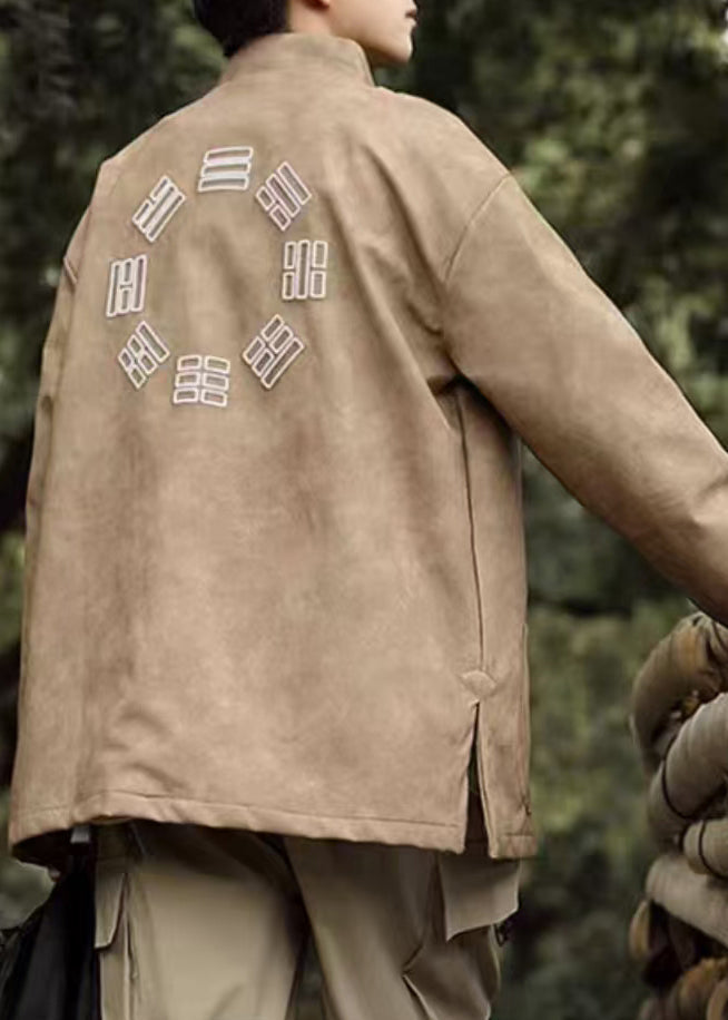 Experience the luxurious warmth and sophistication of our Khaki Pockets Faux Leather Mens Coats, featuring a stylish stand collar for a touch of refined elegance during the winter season.