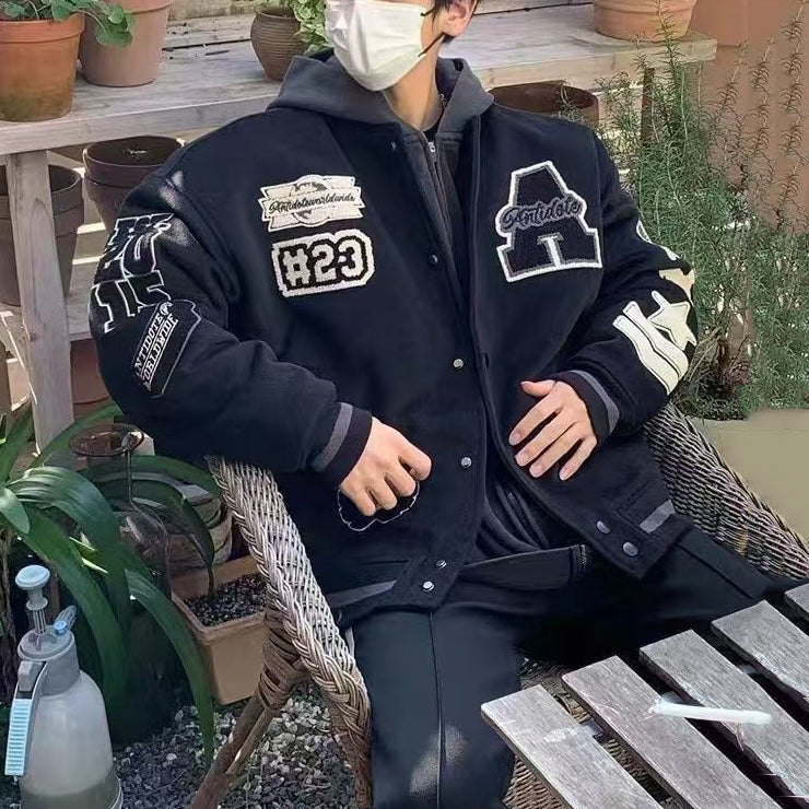 Mens Embroideried Spring Loose Cotton Patchwork Coats TC008 Black