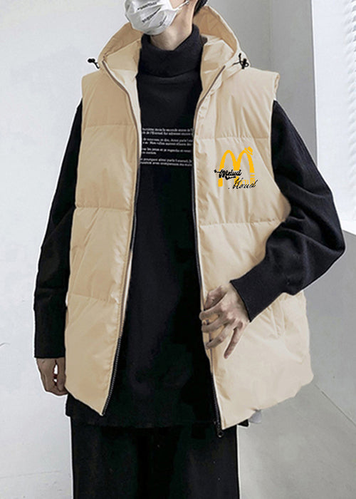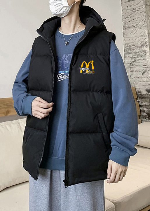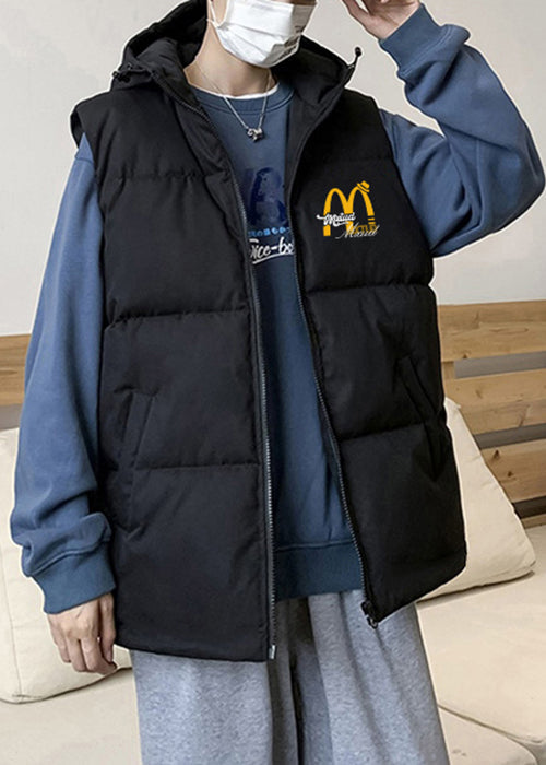 Loose Black Hooded Zippered Print Cotton Filled Men Waistcoat Sleeveless EQ030
