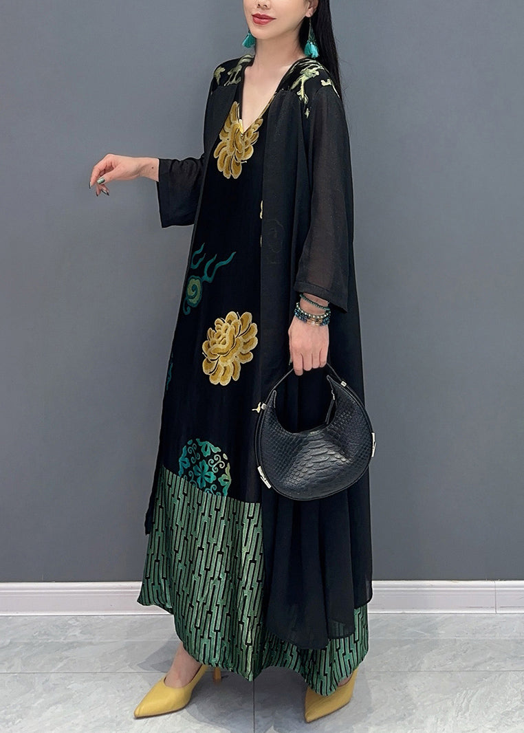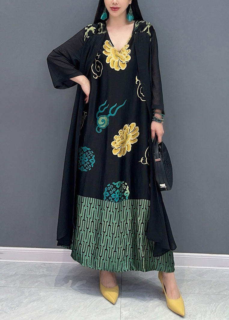 Loose Black V Neck Fake Two Piece Printed Dress For Summer AO1065