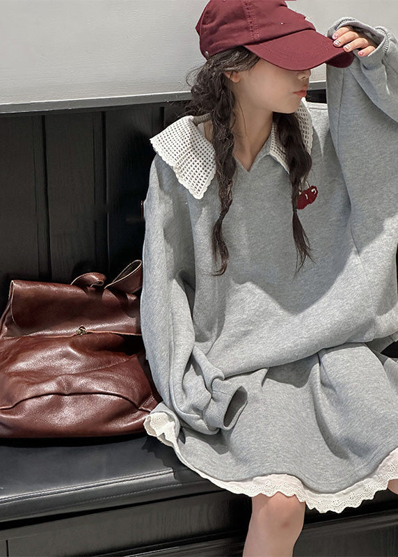 Loose Grey V Neck Cotton Kids Pullover And Skirts Two Piece Set Spring TV026