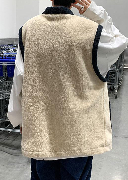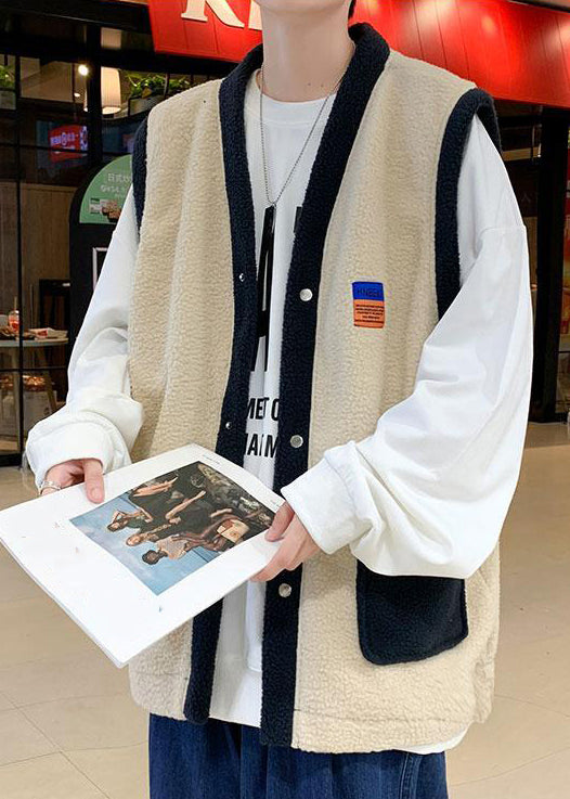 Loose Khaki Button Patchwork Teddy Faux Fur Mens Waistcoat Sleeveless RJ035