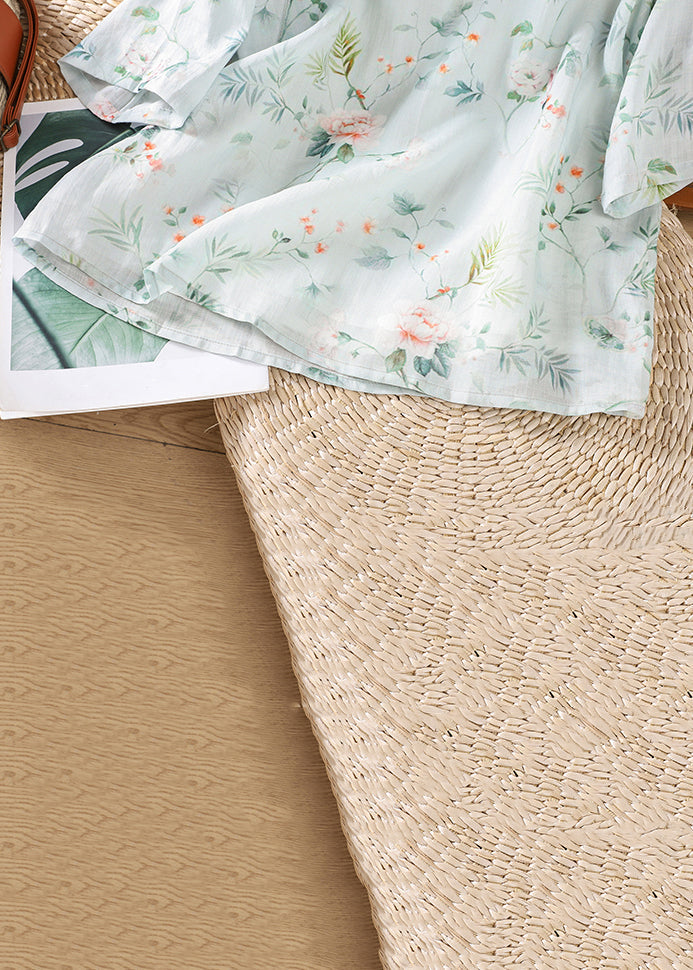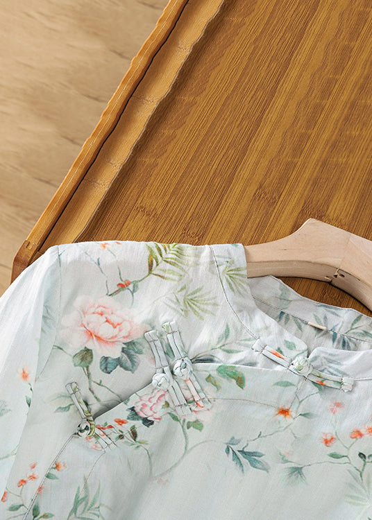Loose Light Blue Stand Collar Print Linen Shirts Half Sleeve JH057