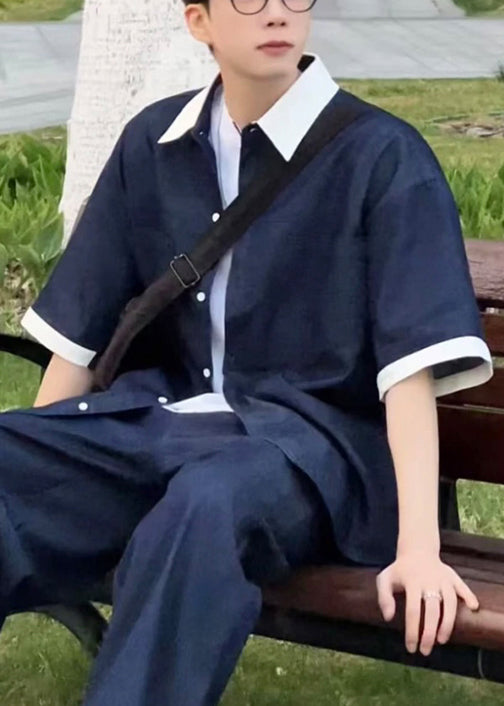 Loose Pan Patchwork Mens Collar Peter Summer Shirts Navy Denim