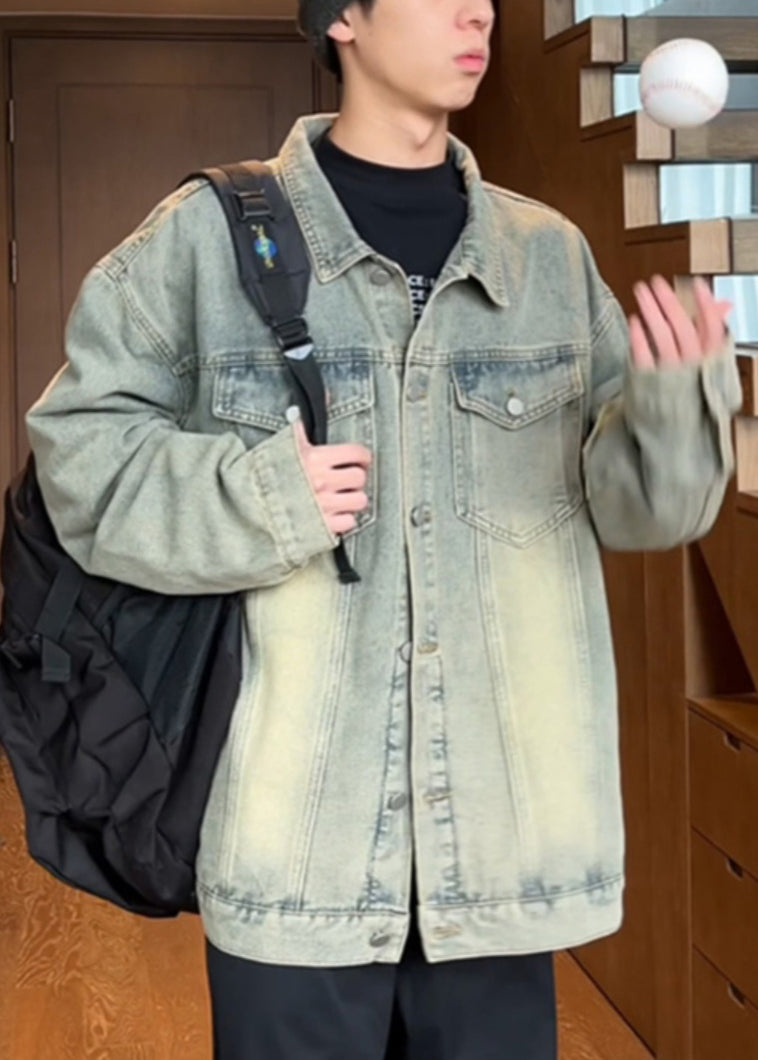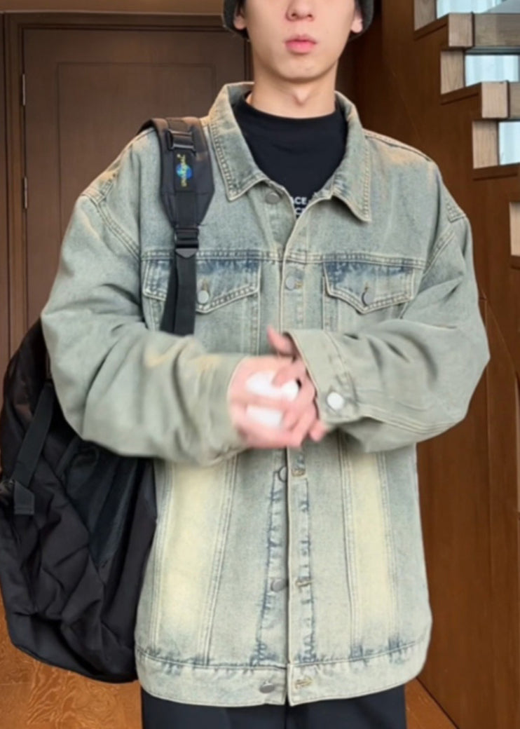 Vintage Mud Yellow Peter Pan Collar Button Denim Mens Coats Spring