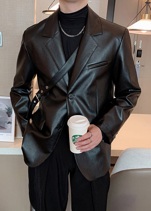 Indulge in the refined elegance of our Modern Black Peter Pan Collar Button Faux Leather Men's Coats for Spring, exuding luxury and sophistication.