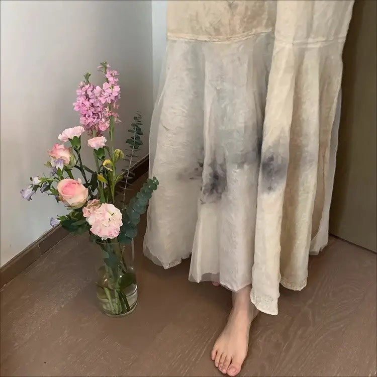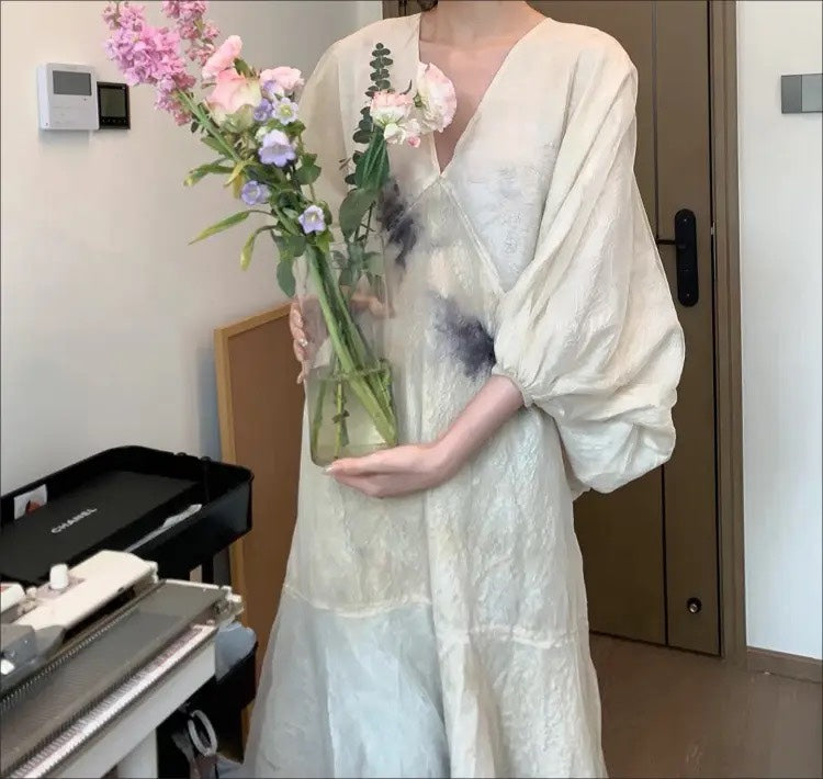 Original Design V Neck Print Patchwork Cotton Dresses Lantern Sleeve WW1001