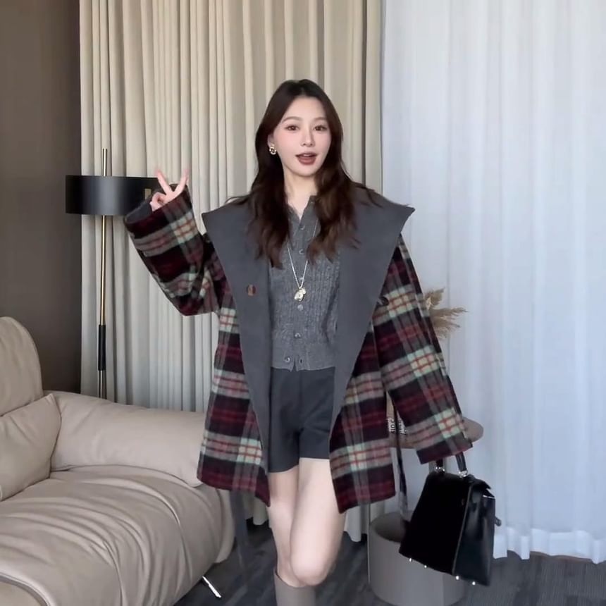 Plaid Reversible Hood Tie Front Coat